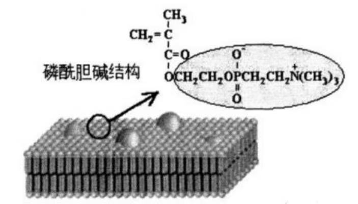 在磷酰胆碱的分子结构中,一部分是疏水非极性长碳键的烃基,另一部分是亲水的极性偶极离子,即磷酸胆碱基团,当其置于水中后,极性基团指向水面,疏水部分因对水的排斥作用而相互聚集,与水隔开,形成所谓的类磷脂双分子层,与细胞膜的结构极其相似,具有优良的生物相容性。